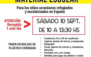 Atención‼️ Solo el SÁBADO 10 de SEPT. de 10 a 13:30 Hs. recogemos material escolar para niños 🇺🇦 ucranianos refugiados en España 🇪🇸