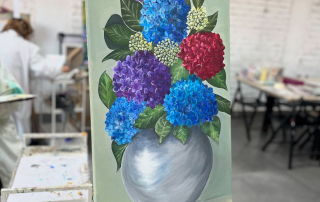 Una serena composición de hortensias en tonos azul, malva y rosa pintada al óleo. Sobre un lienzo alargado, la disposición nos invita a recorrer cada detalle de las flores y disfrutar de la profundidad en cada pincelada.