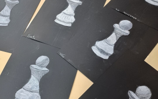 Hoy compartimos uno de los ejercicios de este mes del grupo Junior 🎨🖌️, nuestros artistas de entre 9 y 12 años. Este dibujo, hecho con lápiz blanco sobre cartulina negra, representa unos peones de ajedrez 🖤🤍 y fue creado del natural (still life), trabajando directamente con el objeto real frente a ellos.