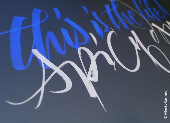 Alberto, para iniciarnos, nos propone utilizar la herramienta Brushpen (rotulador con punta flexible que nos permite modular la letra y trabajar de una manera muy limpia y cómoda) y comenzar con el estilo basado en la familia de letra itálica con esqueleto renancentista que mostramos a continuación.