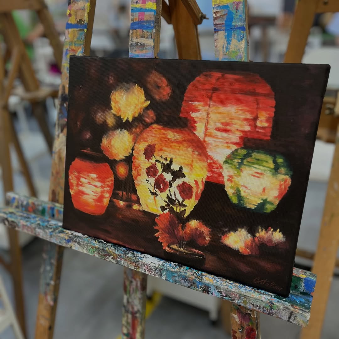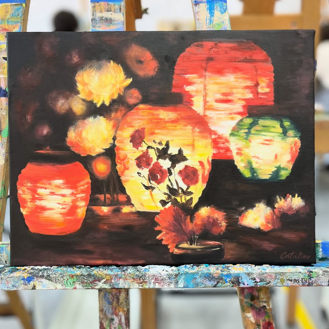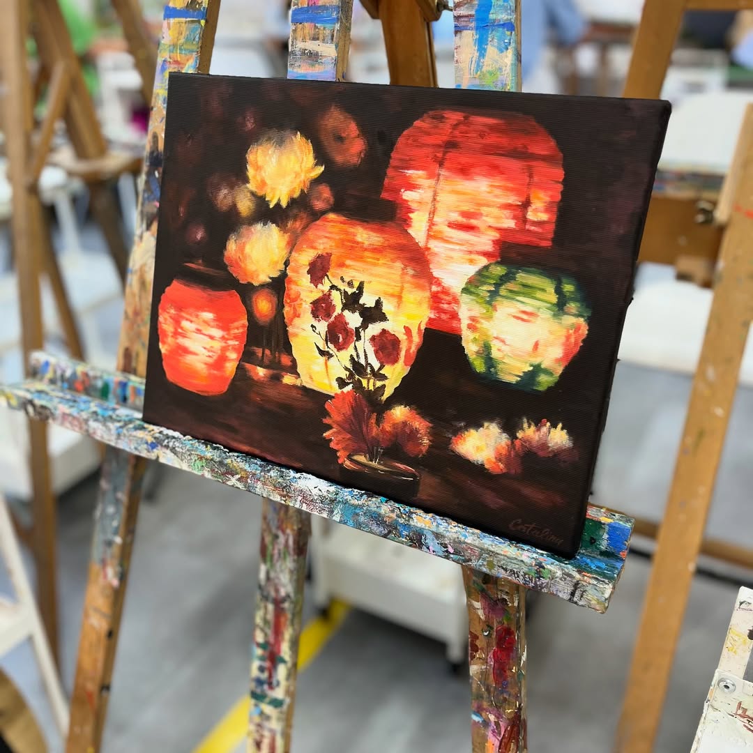 ¡Mirad qué impresionante obra al óleo de nuestra alumna Catalina Capilla! 🖼️🎨 Captura con maestría una escena de lámparas chinescas donde las luces brillan suavemente en la oscuridad, mostrando su técnica impecable y sensibilidad artística. 😍🔥🌙