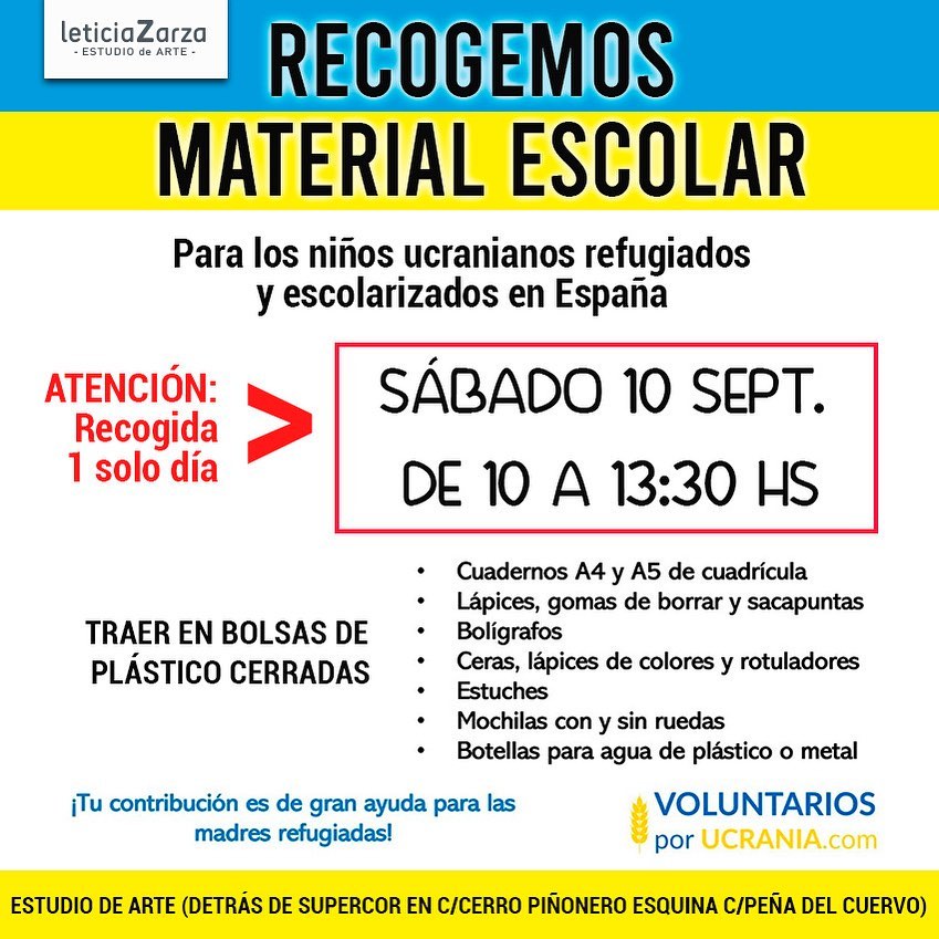 Atención‼️ Solo el SÁBADO 10 de SEPT. de 10 a 13:30 Hs. recogemos material escolar para niños 🇺🇦 ucranianos refugiados en España 🇪🇸