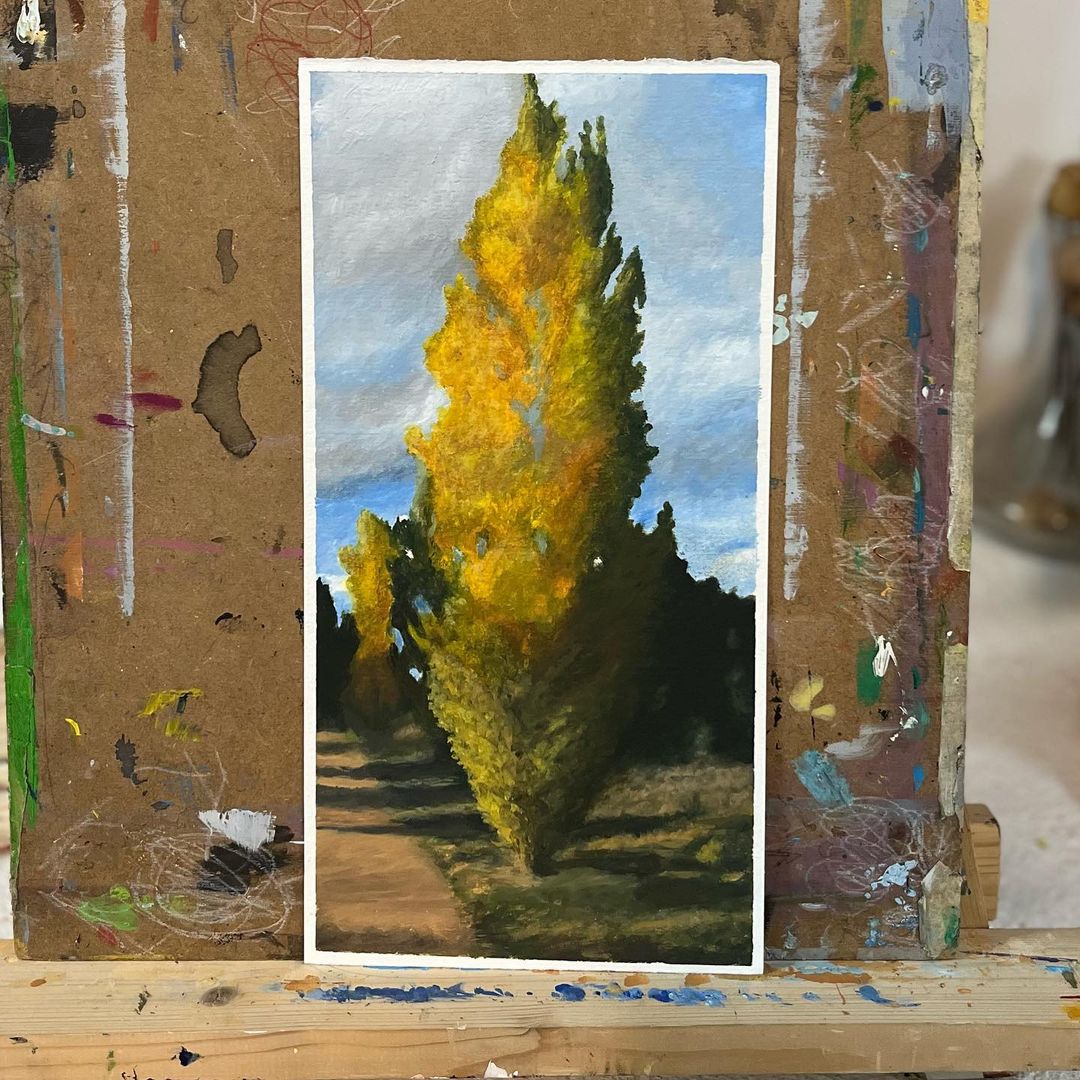 La aparente sencillez de un árbol: su porte, la atmósfera que le rodea, la luz ☀️, el cielo algodonoso ☁️, las sombras de los árboles que no vemos y… ¡la magia de la pintura! 🪄