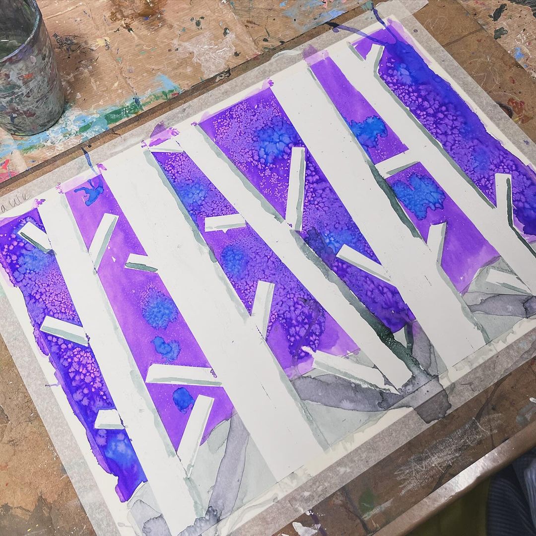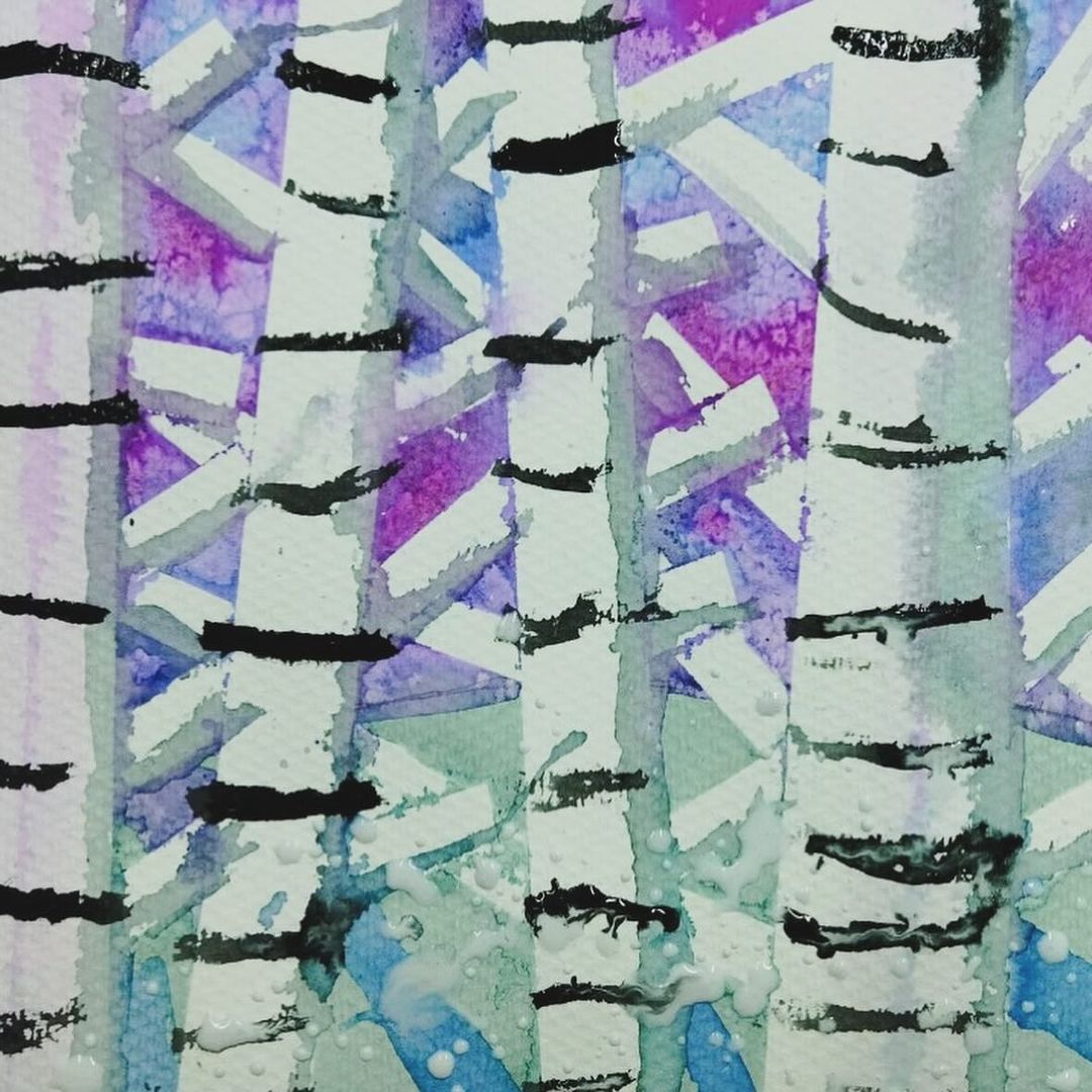 Dejamos que la creatividad 🧑🎨 florezca con un bosque de abedules sobre un fondo morado y la magia de la acuarela 💦