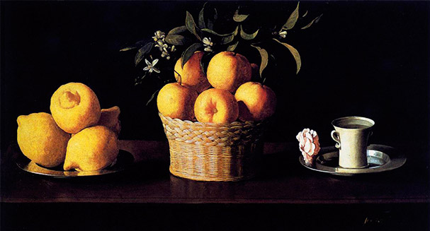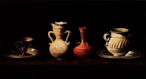 Otro de los géneros que dominó con estilo propio fue la Naturaleza muerta o bodegón. Este género se caracteriza porque en él solo se representan objetos y comida. El realismo de Zurbarán nos muestra las calidades y características de la superficie de los objetos (metal, barro, cerámica) y alimentos (frutas, flores, etc.) Su manera de componer los objetos en el cuadro, el fuerte contraste de luces y sombras y el color, forman una obra muy innovadora y moderna para la época.