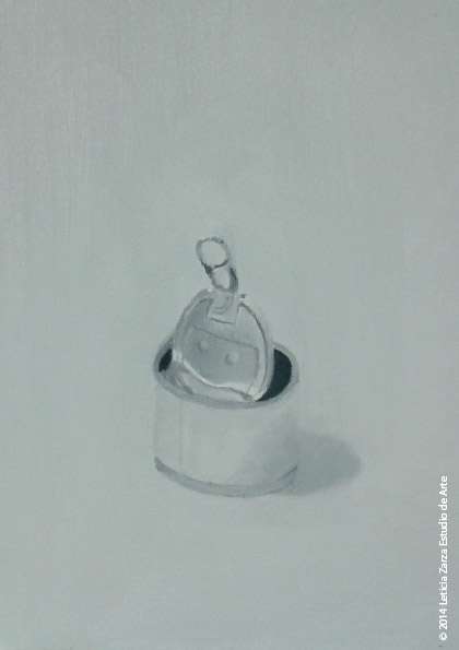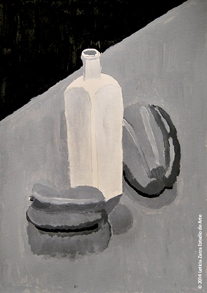 Se trata de un ejercicio monocromático en escala de grises. Usamos únicamente pintura blanca y negra y la mezclamos en diversas proporciones para conseguir los distintos matices y tonos de grises con el fin de pintar una figura u objeto volumétrico.
