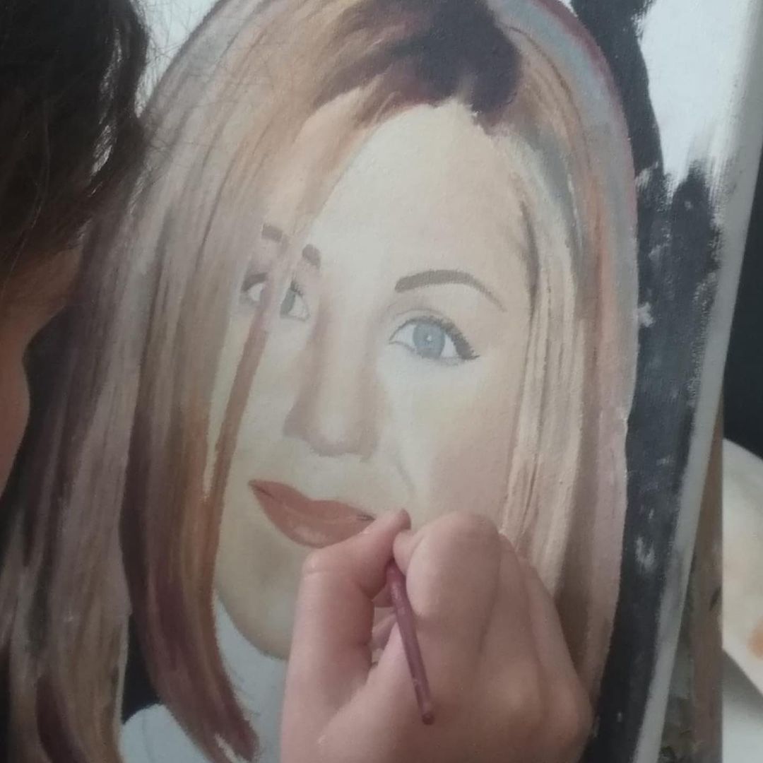 Nuestra alumna Sara Camps (15 años) es muy fan de @jenniferaniston y está haciendo un retrato con óleo 👌